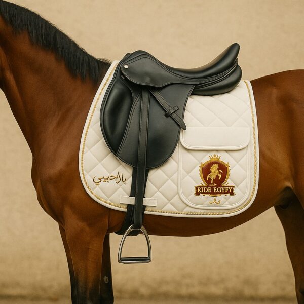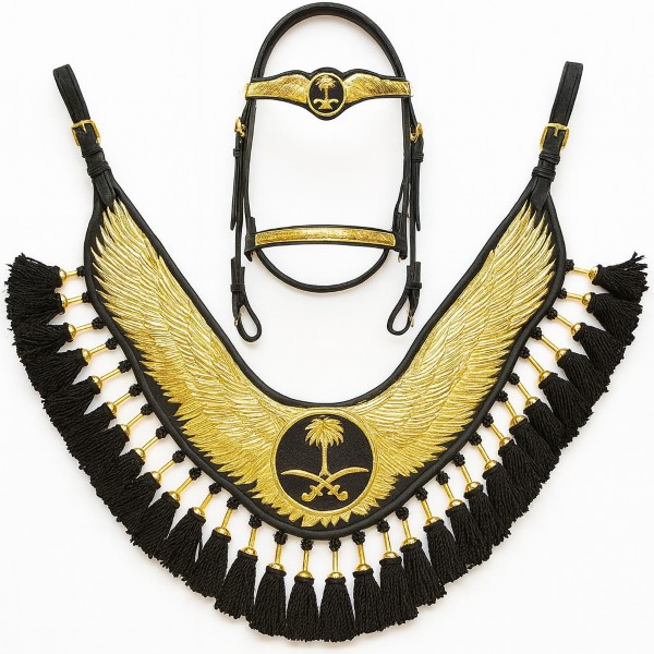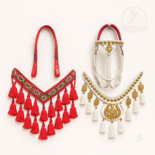 A breastplate fit for royalty, this piece marries pure white with the radiance of gold. The medallions echo ancient coins, carrying the weight of Egypt’s heritage. Every tassel swings like a pageantry flag, evoking images of horses carrying kings and queens through temples and deserts. Symbolizing purity, celebration, and divine blessing, it transforms every horse into a vision of nobility.