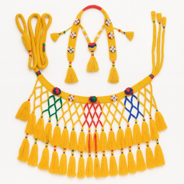 Alive with color, this handwoven yellow wool set is a tribute to Egypt’s festive spirit. With its rainbow of tassels and hand-knotted lattice, it recalls the laughter of village celebrations, drums echoing, and horses parading proudly under the sun. Each strand is spun from natural wool, hand-dyed and crafted with the same traditions passed through generations.
