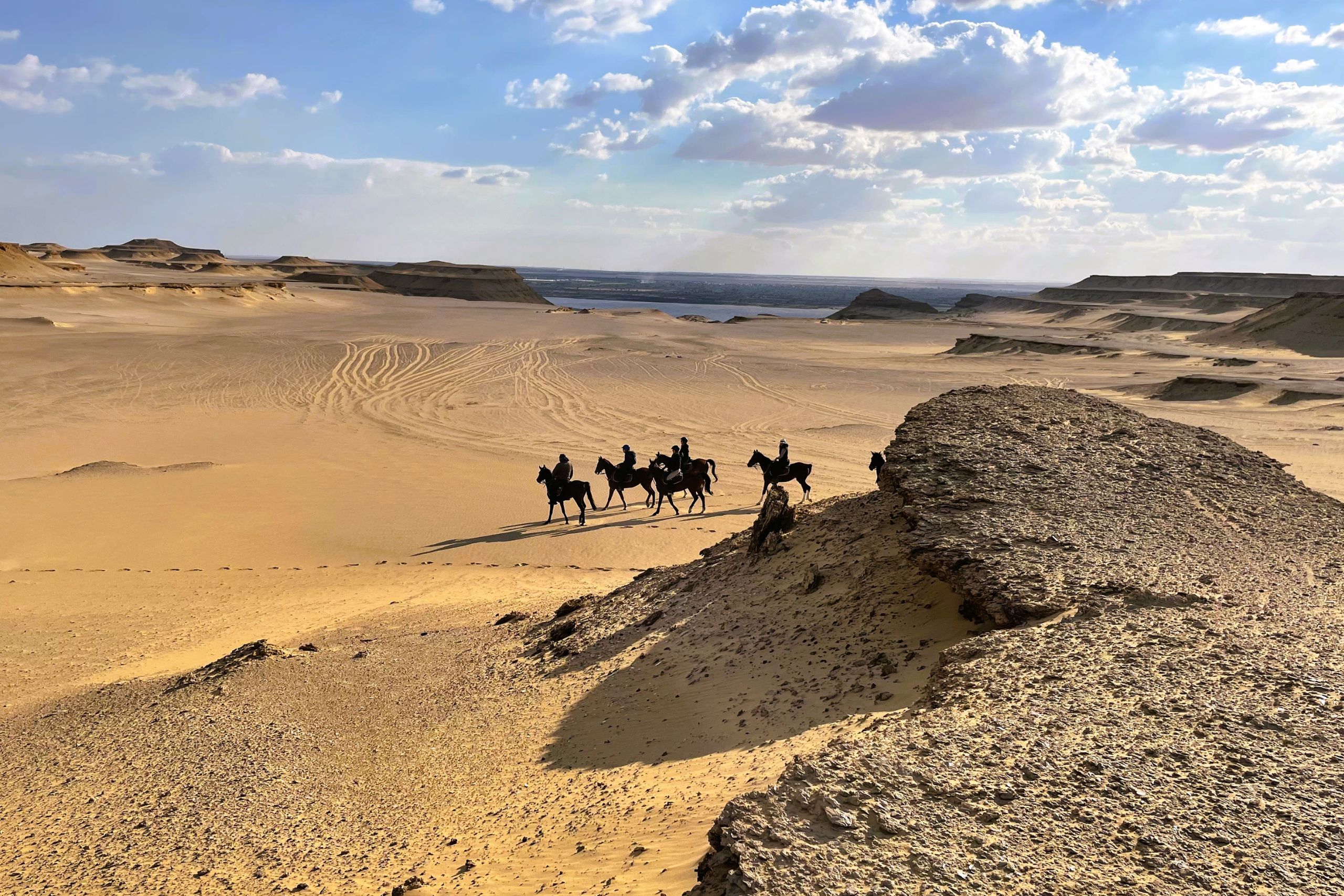After breakfast, we head by road to Fayoum, a region renowned for its rich history, archaeological sites, and stunning landscapes, including magnificent dunes and fossilized remains, making it wonderful riding destination. Upon arrival, enjoy a delicious lunch before saddling up for a 4-hour horseback ride to Magic Lake. Known for its ever-changing colors caused by its high mineral content, Magic Lake offers a surreal setting amidst the desert landscape.